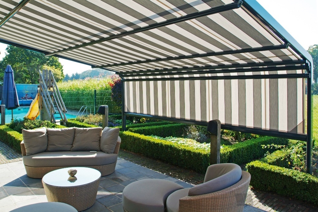Eine Terrasse bietet Lebensraum für Sie und Ihre Familie. Um auch im Sommer bei hohen Temperaturen und direkter Sonneneinstrahlung eine angenehme Zeit auf Ihrer Terrasse verbringen zu können ist der Sonnenschutz ein wichtiger Faktor. Dort wo eine klassische Gelenkarmmarkise an seine Grenzen stößt, kommen die Vorteile einer Terrassenmarkise zum Zuge. Hier kann ein maximaler Ausfall von 900 cm realisiert werden. Da die Anlagen koppelbar sind, ist der Gesamtbreite theoretisch keine Grenzen gesetzt.