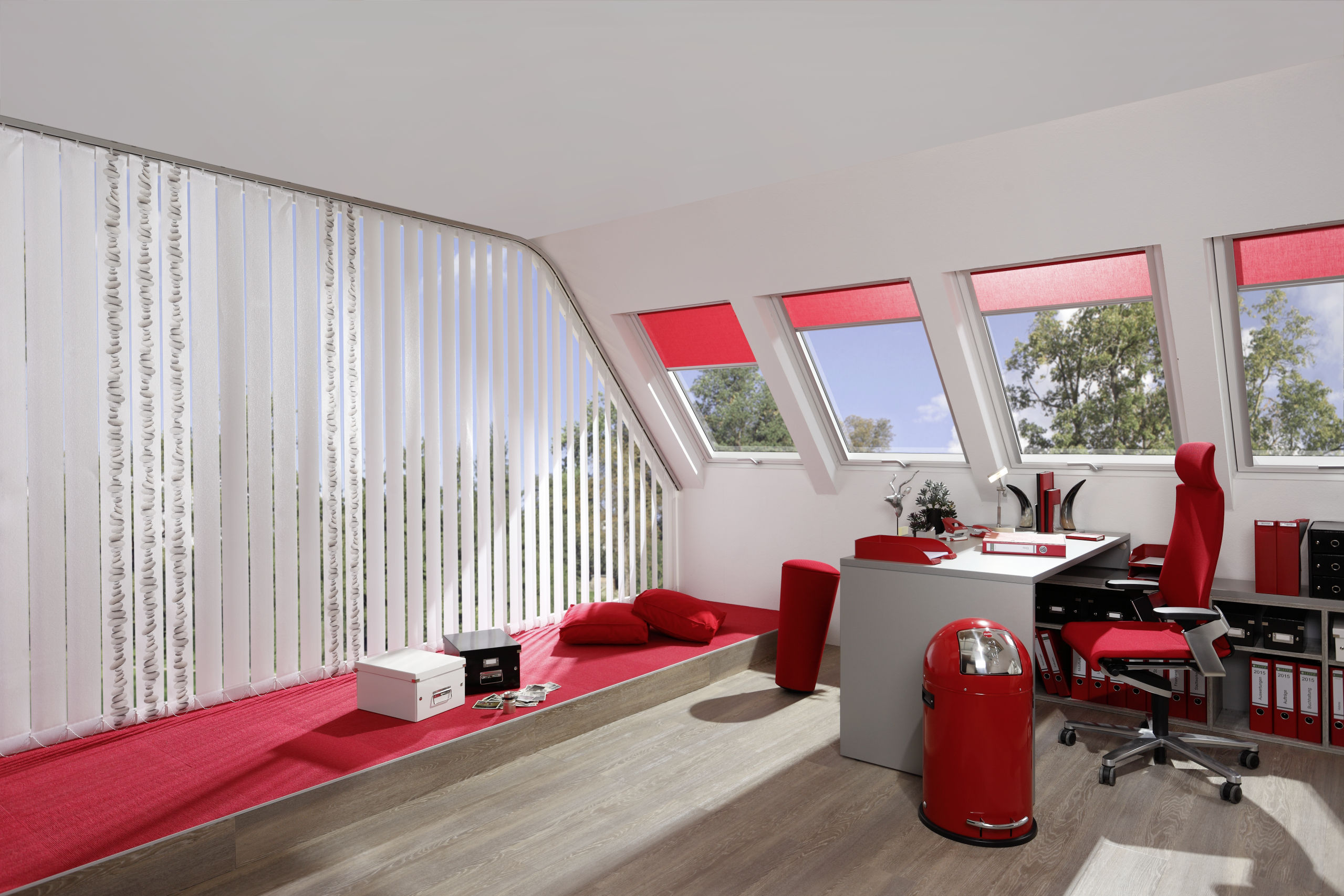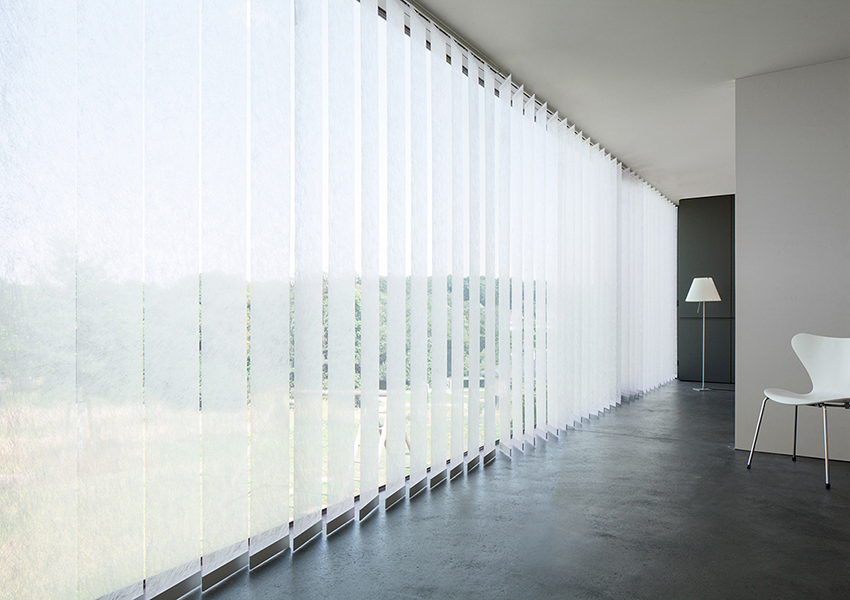 Gebogene Führungsschienen ermöglichen auch die Beschattung von außergewöhnlichen Raumformen. Spezielle Ausrüstungen wie etwa schwerentflammbar, antibakteriell, schmutz- und feuchtigkeitsabweisend sowie reflektierend geben vielen Stoffen zusätzliche funktionale Eigenschaften. An Bildschirmarbeitsplätzen werden somit störende Spiegelungen verhindert.